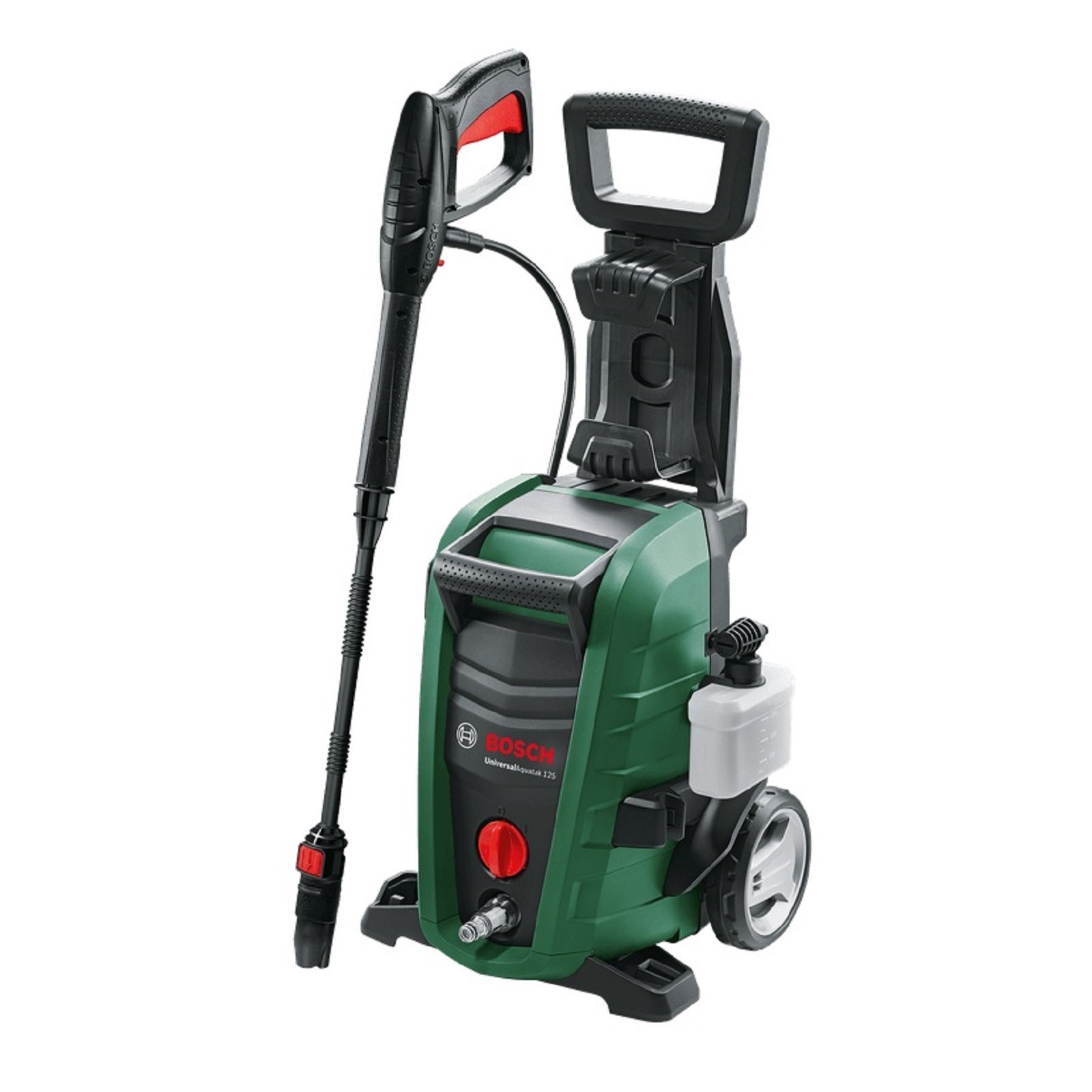 - The UniversalAquatak 125 provides fast, flexible, and effortless cleaning. The Trio Nozzle handles a wide variety of cleaning tasks, from garden furniture to gutters. The fan, rotary, and pencil jet settings meet the individual challenges of each job. Save time cleaning cars with the 450-ml High-Pressure Detergent Nozzle. The extendable handle and large wheels offer increased mobility and easy storage. With a quieter motor pump, the high-pressure washer increases comfort when cleaning. Push-fit connections and in-use gun storage make cleaning simple.