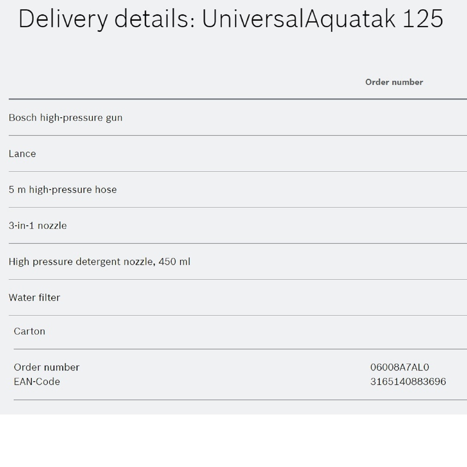 - Set comes with 1 unit of UniversalAquatak 125, 1nos of 3-in-1 nozzle, 1roll of 5mtr high-pressure hose, 1nos of BOSCH high-pressure gun, 1nos of 450ml high pressure detergent nozzle, 1nos of lance and 1nos of water filter.
