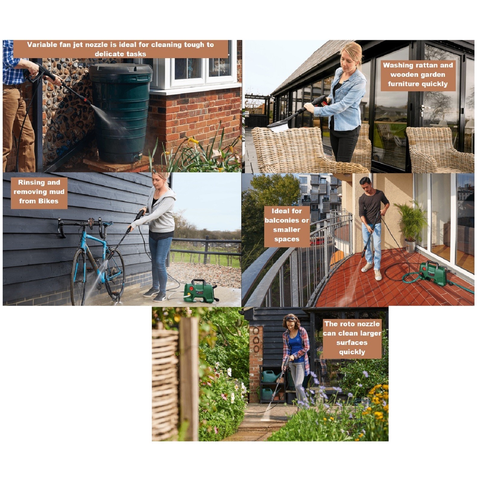 - With 110-bar cleaning power and a choice of Variable Fan Jet and Rotary Nozzles, cleaning cars, patios, and garden furniture is easy.