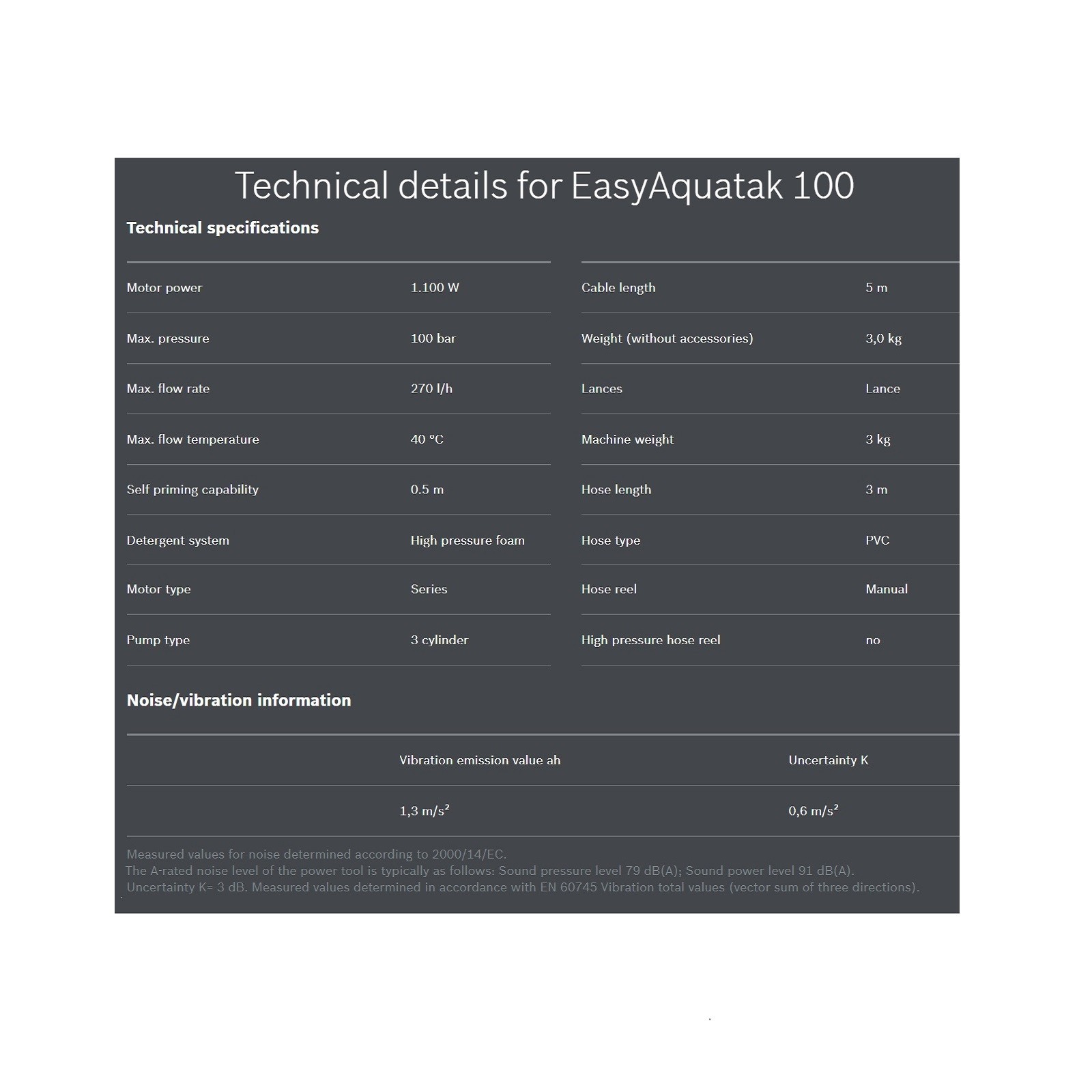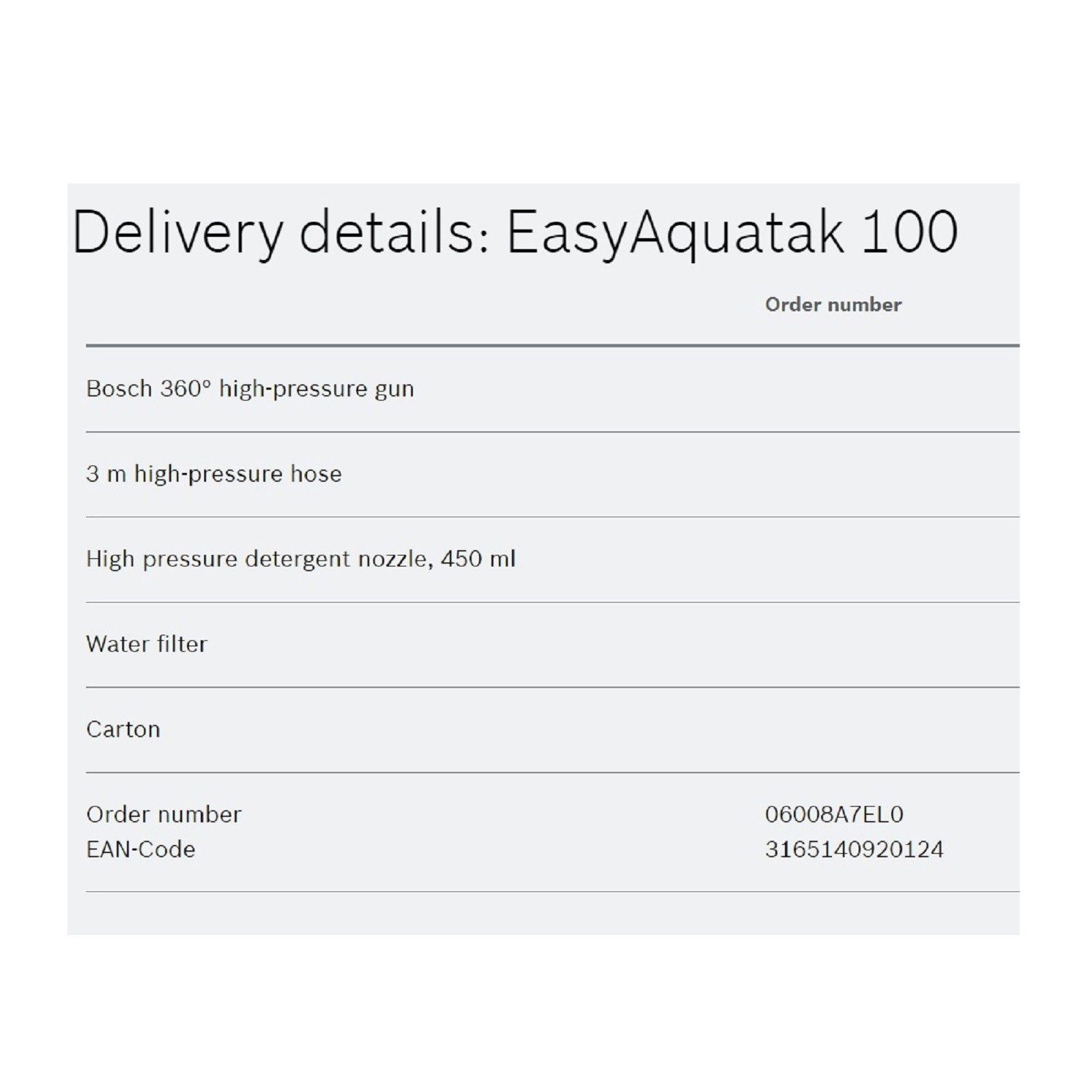 - This high-pressure washer is the handy solution for regularly tackling dirty surfaces. The Bosch 360° Gun makes it easy to clean hard-to-reach spaces. One-handed operation provides more freedom and manageability for faster results. Additionally, the fan jet can be adjusted from a powerful jet spray to a gentle rinse, to suit the cleaning task. The EasyAquatak 100 can be used for cleaning cars, waste bins, garden furniture, and windows. It also has a High-Pressure Detergent Nozzle that applies detergent simultaneously with the spray for deep cleaning.