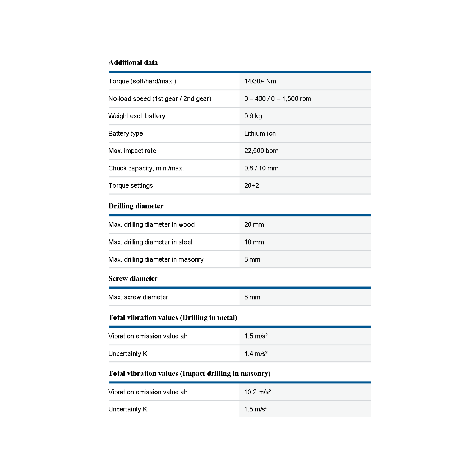 - Total vibration values (Drilling in metal) Vibration emission value Ah