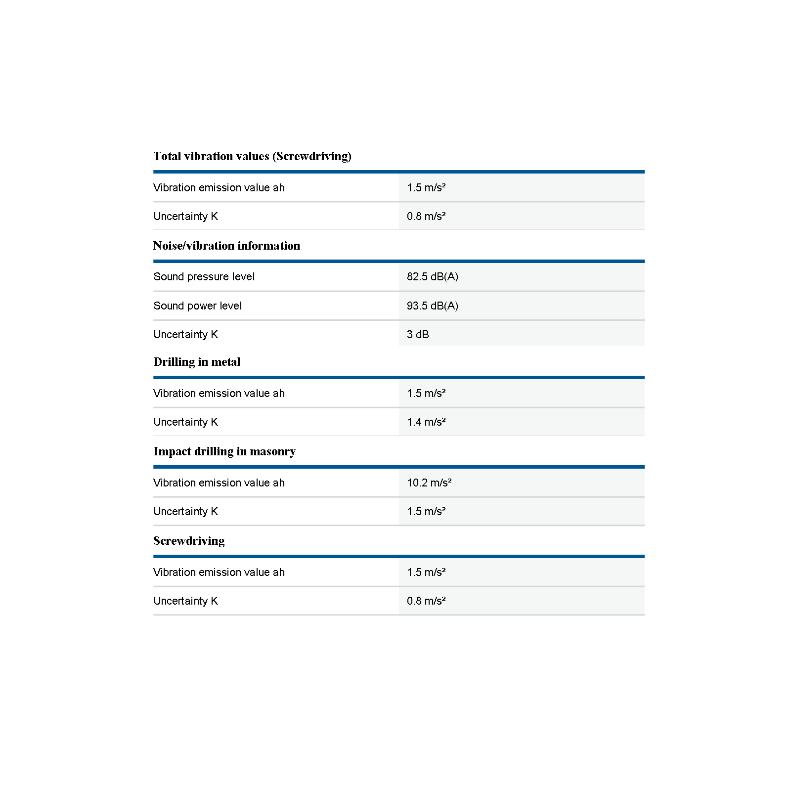 - Total vibration values (Drilling in metal) Uncertainty K