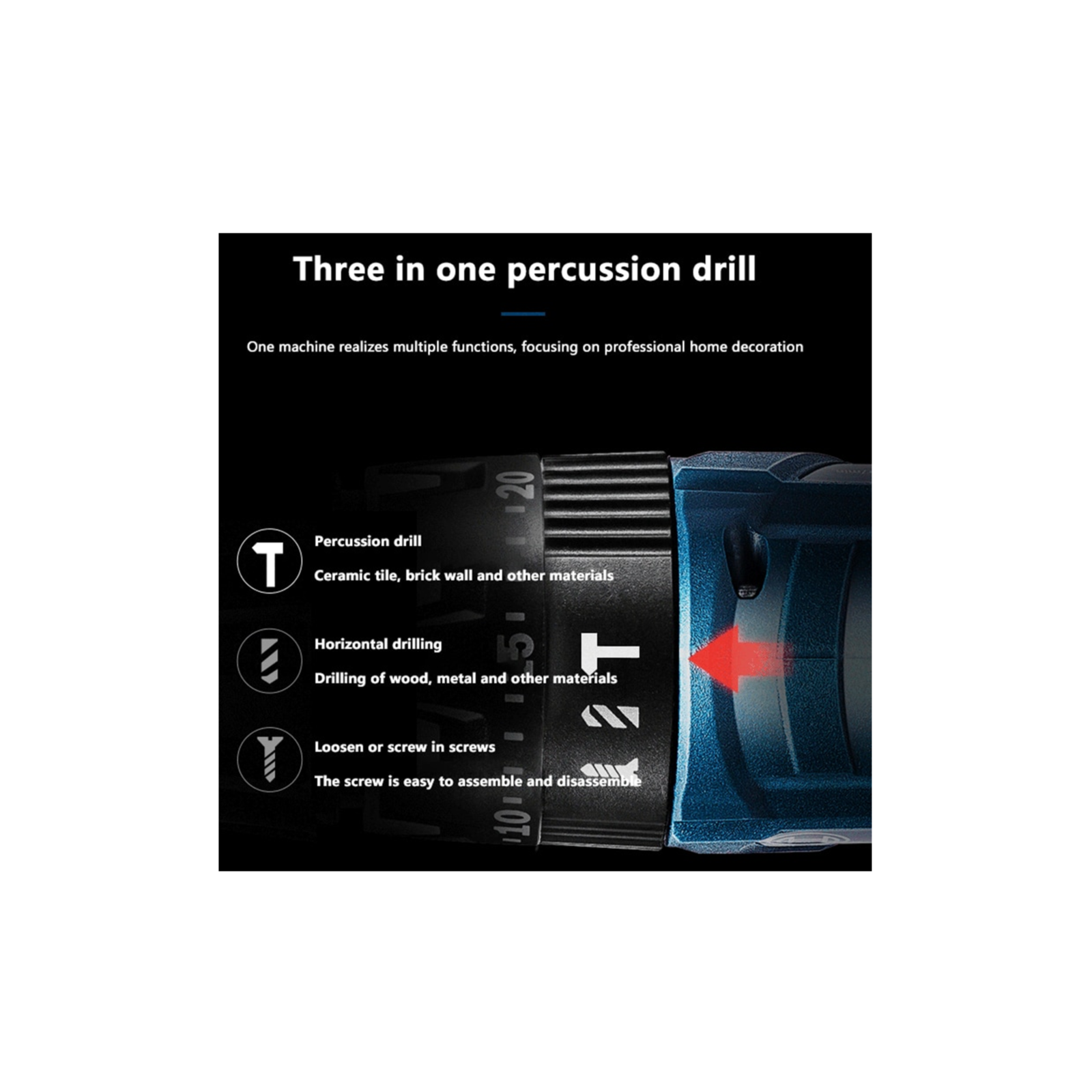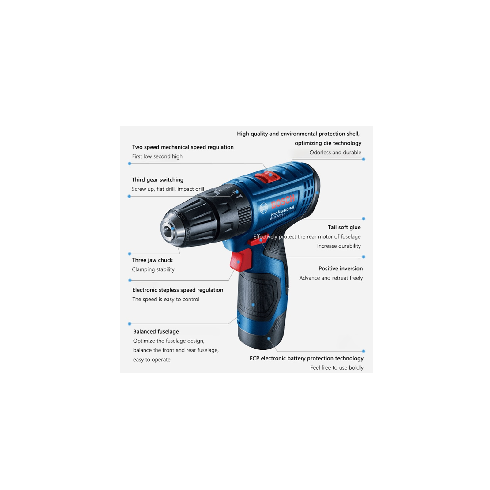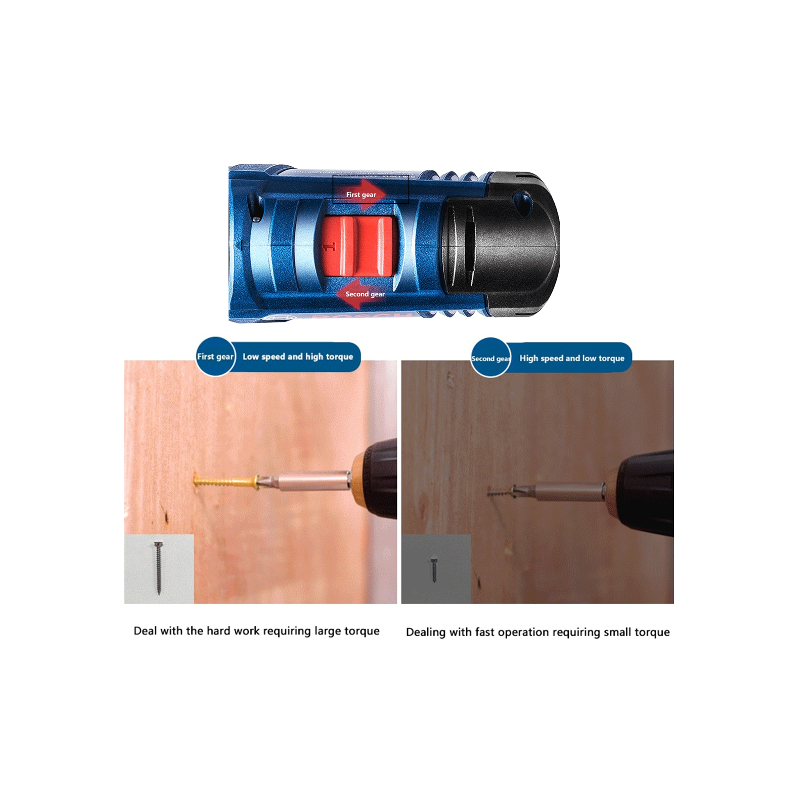 - Optimized torque for screwdriving and speed for drilling.