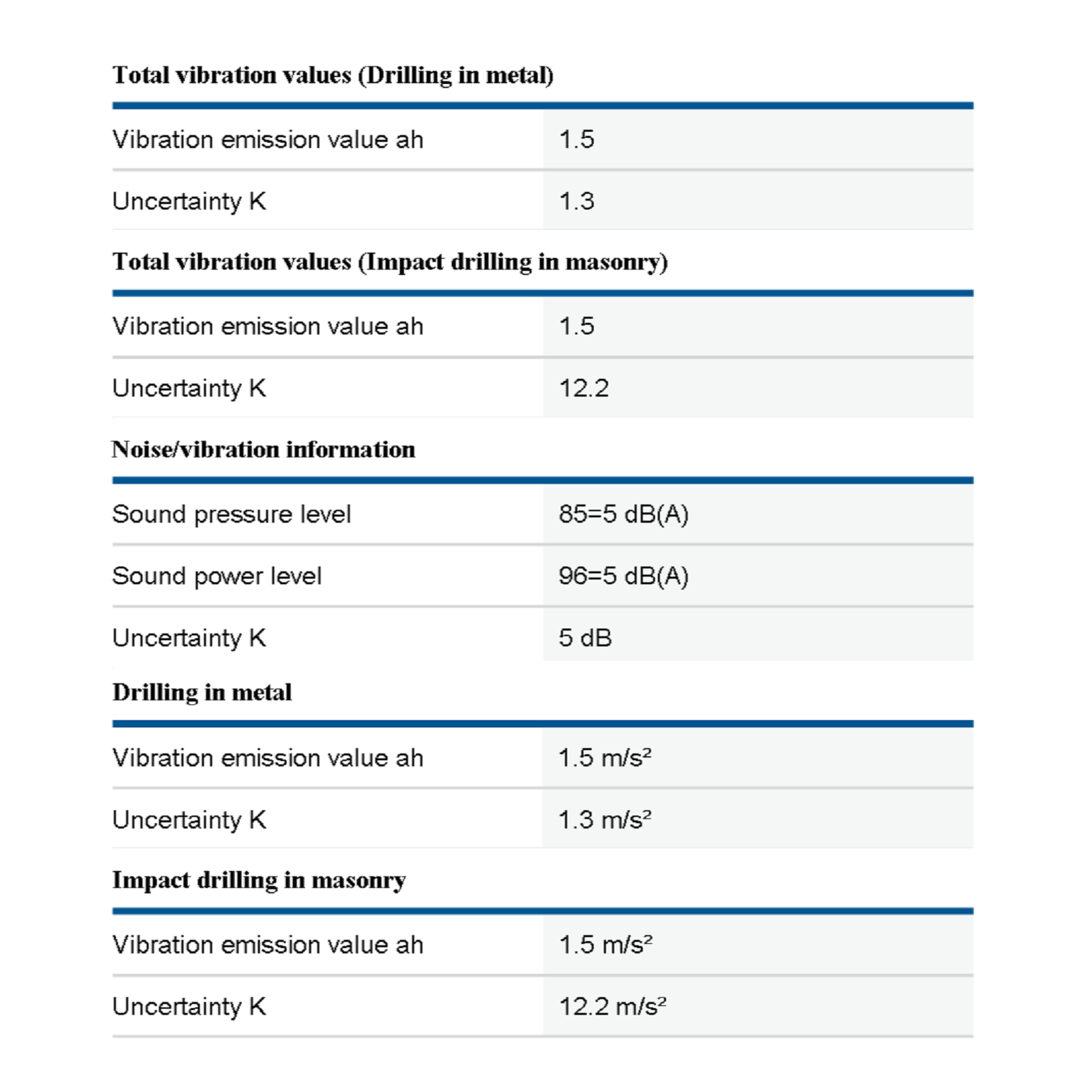 - Total vibration values (Drilling in metal) Uncertainty K