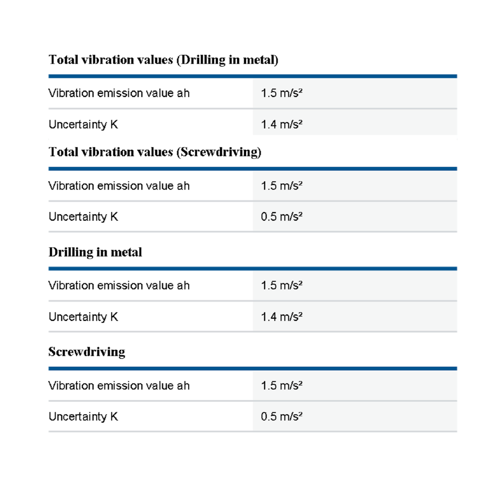 - Total vibration values (Drilling in metal) Uncertainty K