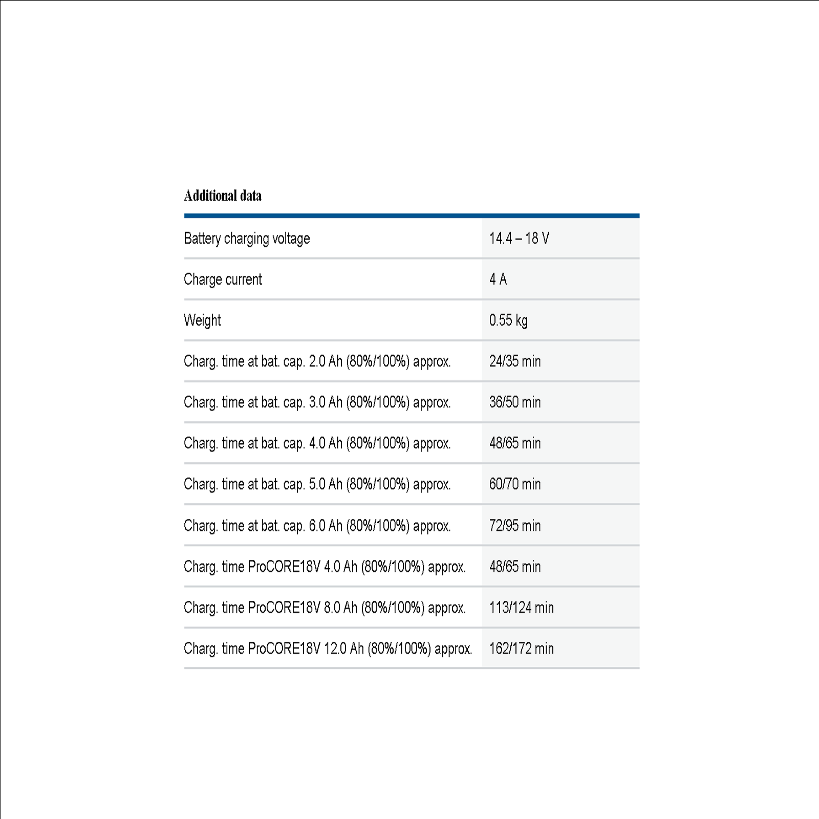 - BOSCH GAL 18V-40 Charger- The compact 18V charger. - Compact: Due to its modern design it is very compact. - Optimised charging speed: Optimised charging speed for compact 18 V batteries as it charges an 18 V 2.0 Ah battery in 36 mins to 80%. - Professional 18V System: 100% compatible with all Bosch Professional 18 V batteries.
